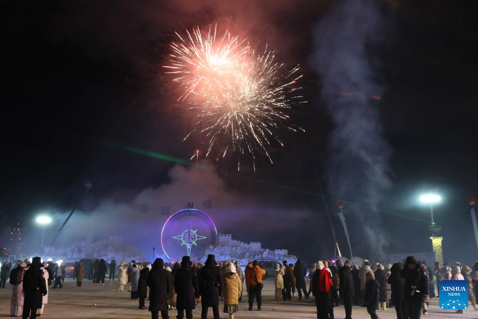 People watch a firework show at a cultural festival on the occasion of the Winter Solstice in Beiji Village of Mohe City, northeast China's Heilongjiang Province, Dec. 21, 2025. People attended a cultural festival marking the Winter Solstice, the shortest day of the year, here on Sunday. (Photo by Shao Tianli/Xinhua)