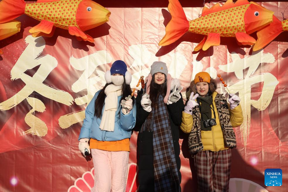 People pose for a photo at a cultural festival on the occasion of the Winter Solstice in Beiji Village of Mohe City, northeast China's Heilongjiang Province, Dec. 21, 2025. People attended a cultural festival marking the Winter Solstice, the shortest day of the year, here on Sunday. (Photo by Shao Tianli/Xinhua)