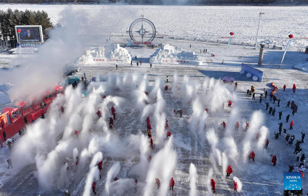 A drone photo taken on Dec. 21, 2025 shows the "water to ice" performance at a cultural festival on the occasion of the Winter Solstice in Beiji Village of Mohe City, northeast China's Heilongjiang Province. People attended a cultural festival marking the Winter Solstice, the shortest day of the year, here on Sunday. (Photo by Shao Tianli/Xinhua)