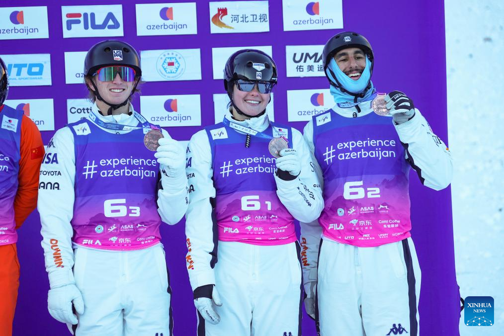 Bronze medalists Kaila Kuhn (C), Ashton Salwan (L) and Connor Curran of team USA 2 celebrate during the awarding ceremony during the mixed team aerials final of FIS Freestyle Ski World Cup 2026 in Zhangjiakou, north China's Hebei Province, Dec. 21, 2025. (Photo by Wu Diansen/Xinhua)