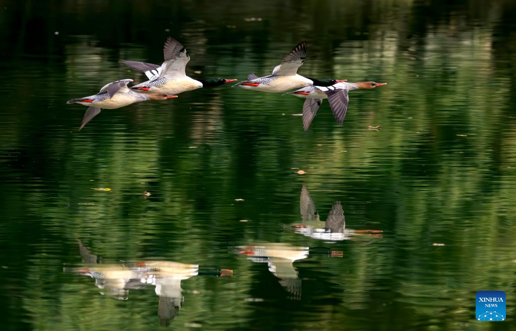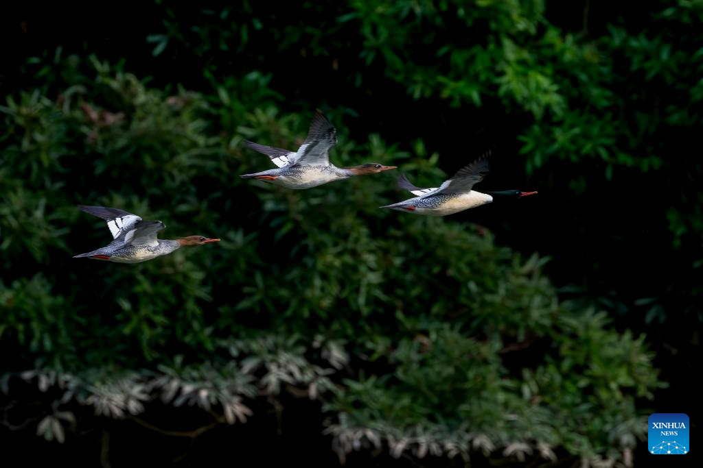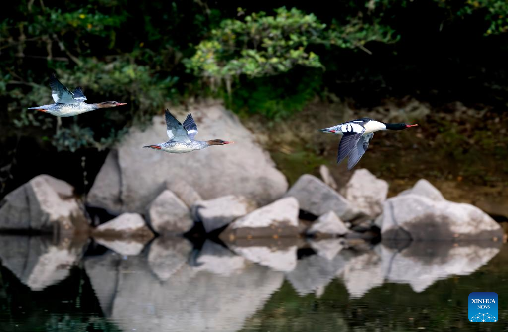 Chinese mergansers fly over the Dazhang River in Yongtai County, southeast China's Fujian Province, Dec. 20, 2025. Sixteen Chinese mergansers, a national first-class protected species, were spotted wintering here. (Xinhua/Wei Peiquan)