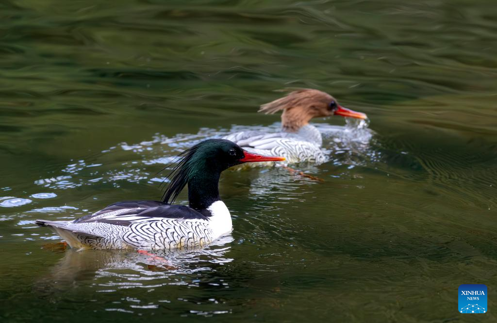 Chinese mergansers swim in the Dazhang River in Yongtai County, southeast China's Fujian Province, Dec. 20, 2025. Sixteen Chinese mergansers, a national first-class protected species, were spotted wintering here. (Xinhua/Wei Peiquan)