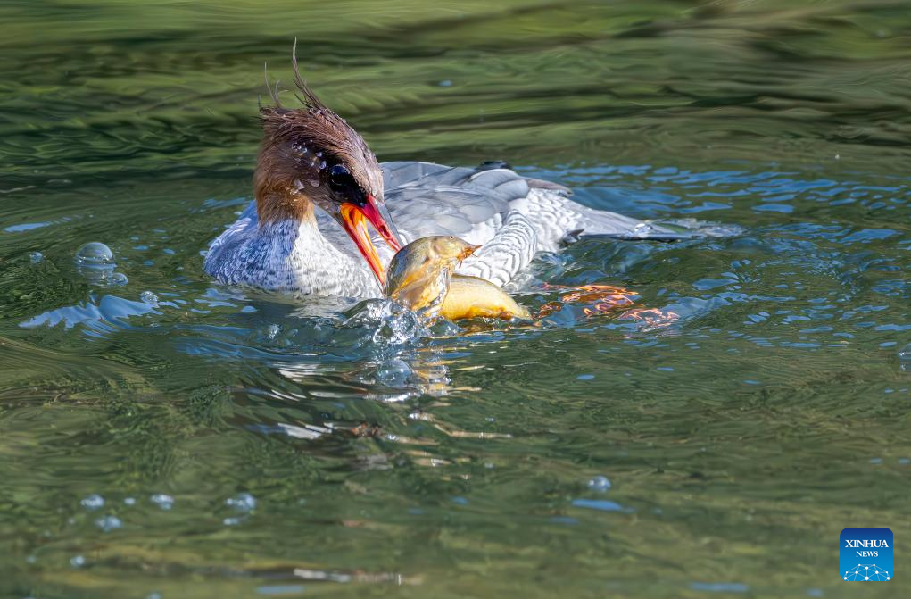 A Chinese merganser forages in the Dazhang River in Yongtai County, southeast China's Fujian Province, Dec. 20, 2025. Sixteen Chinese mergansers, a national first-class protected species, were spotted wintering here. (Xinhua/Wei Peiquan)