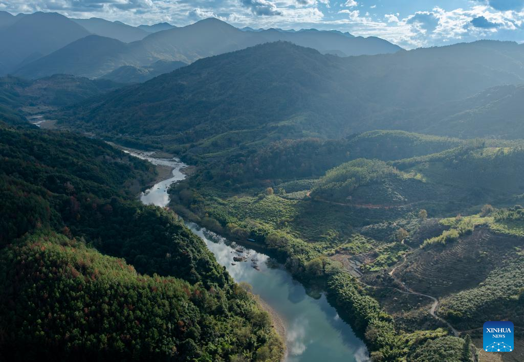 An aerial drone photo shows a view of the Dazhang River in Yongtai County, southeast China's Fujian Province, Dec. 20, 2025. Sixteen Chinese mergansers, a national first-class protected species, were spotted wintering here. (Xinhua/Wei Peiquan)