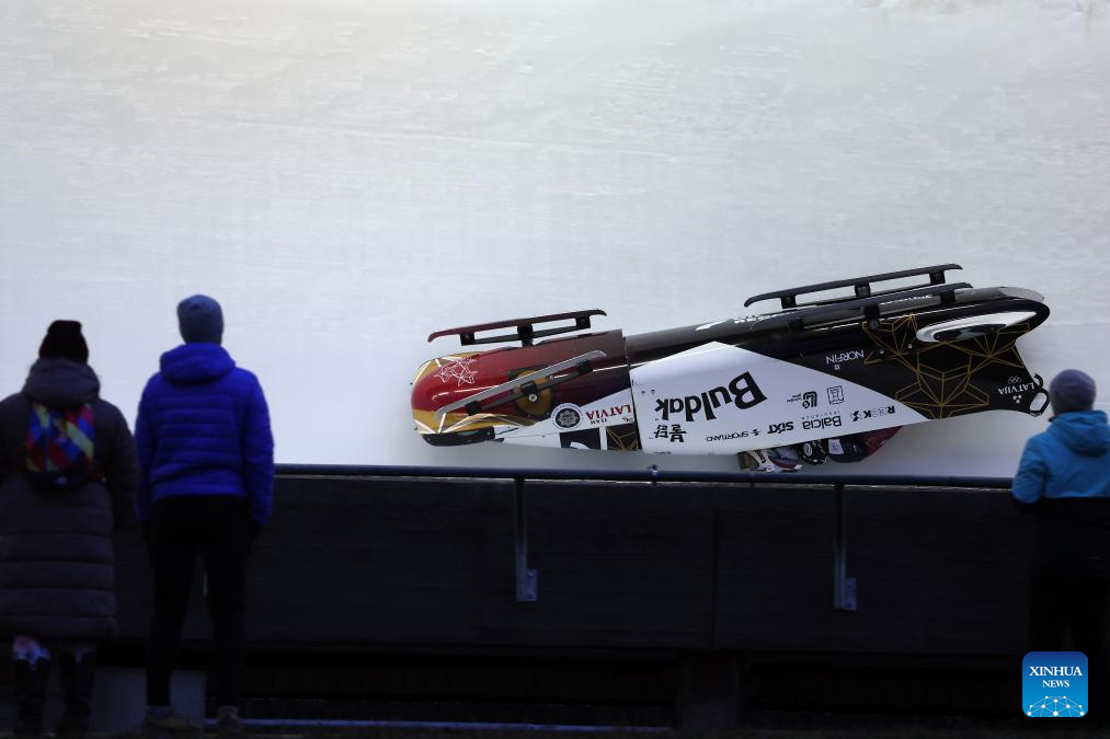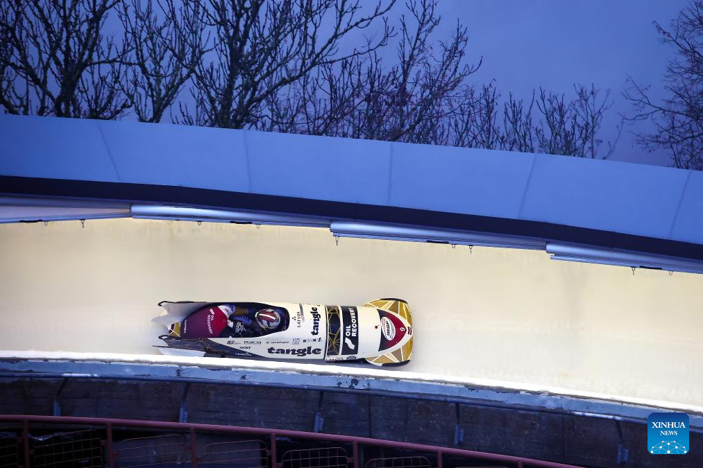 Jekabs Kalenda and Matiss Miknis of Latvia compete during the 2-man bobsleigh heat at the IBSF Bobsleigh and Skeleton World Cup in Sigulda, Latvia, Dec. 20, 2025. (Photo by Edijs Palens/Xinhua)