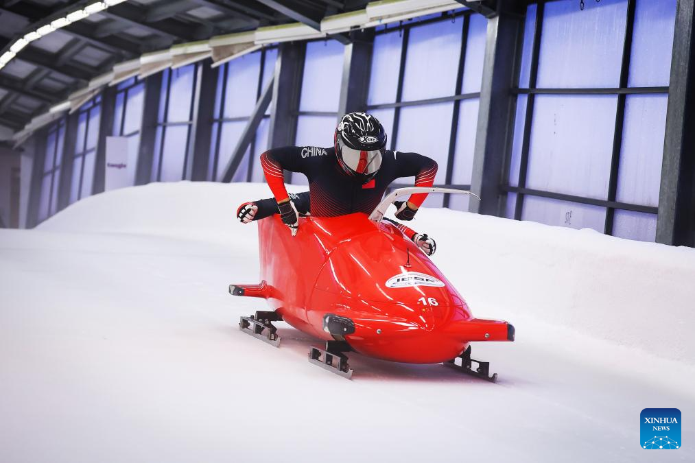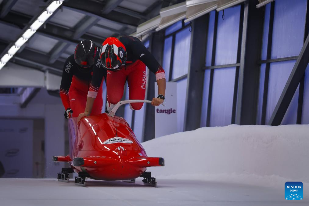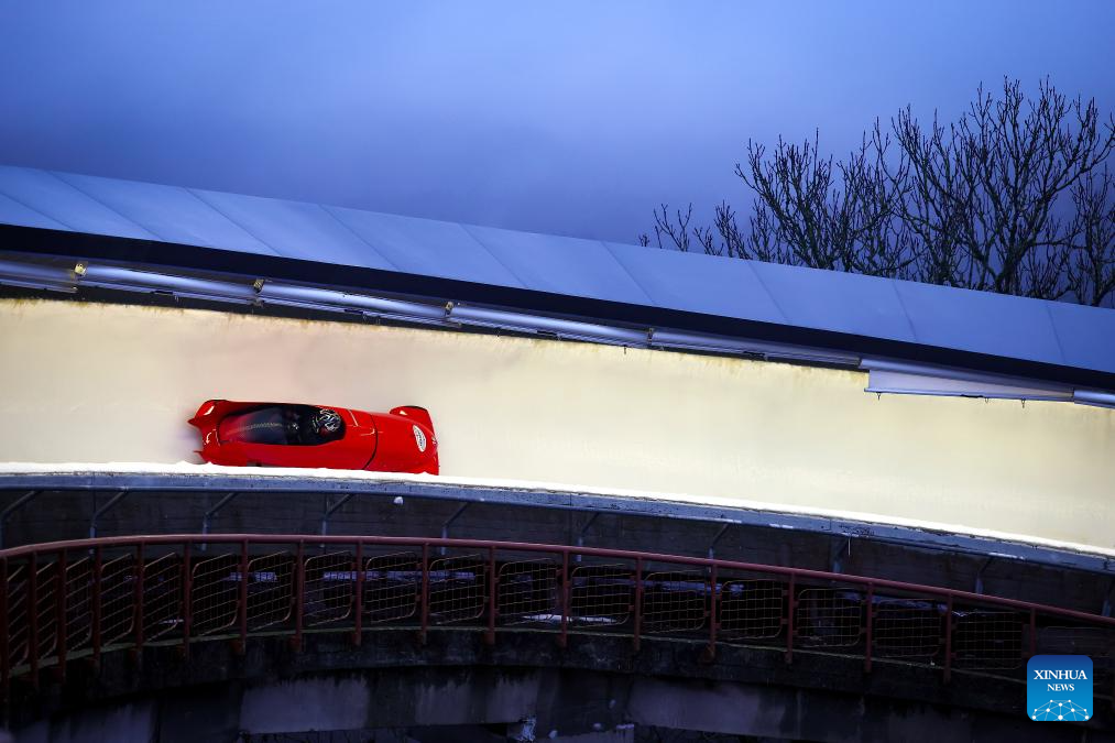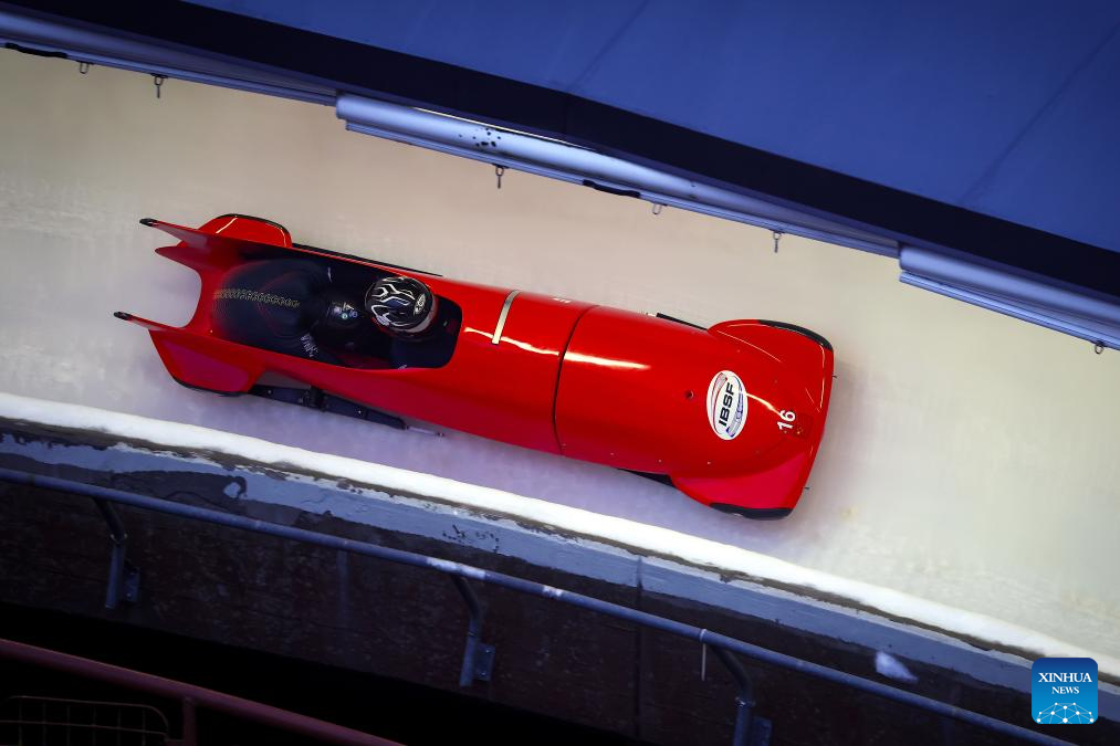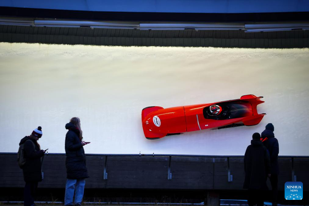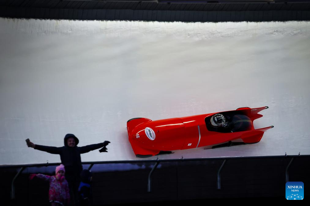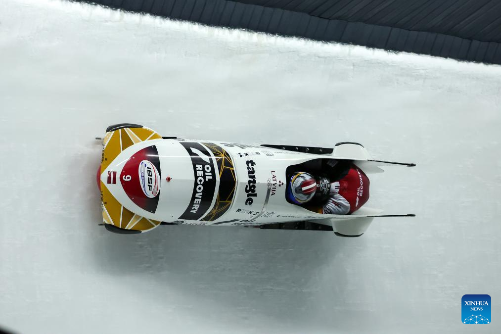 Li Chunjian (front) and Ren Jianzhang of China compete during the 2-man bobsleigh heat at the IBSF Bobsleigh and Skeleton World Cup in Sigulda, Latvia, Dec. 20, 2025. (Photo by Edijs Palens/Xinhua)