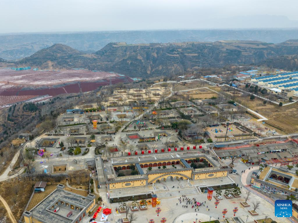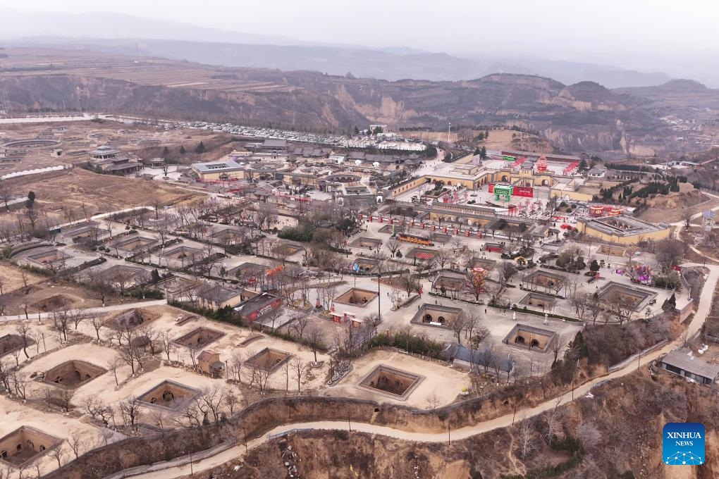 An aerial drone photo taken on Dec. 21, 2025 shows tourists visiting the traditional Dikengyuan residences in Beiying Village, Zhangbian Township, Shanzhou District, Sanmenxia City of central China's Henan Province.