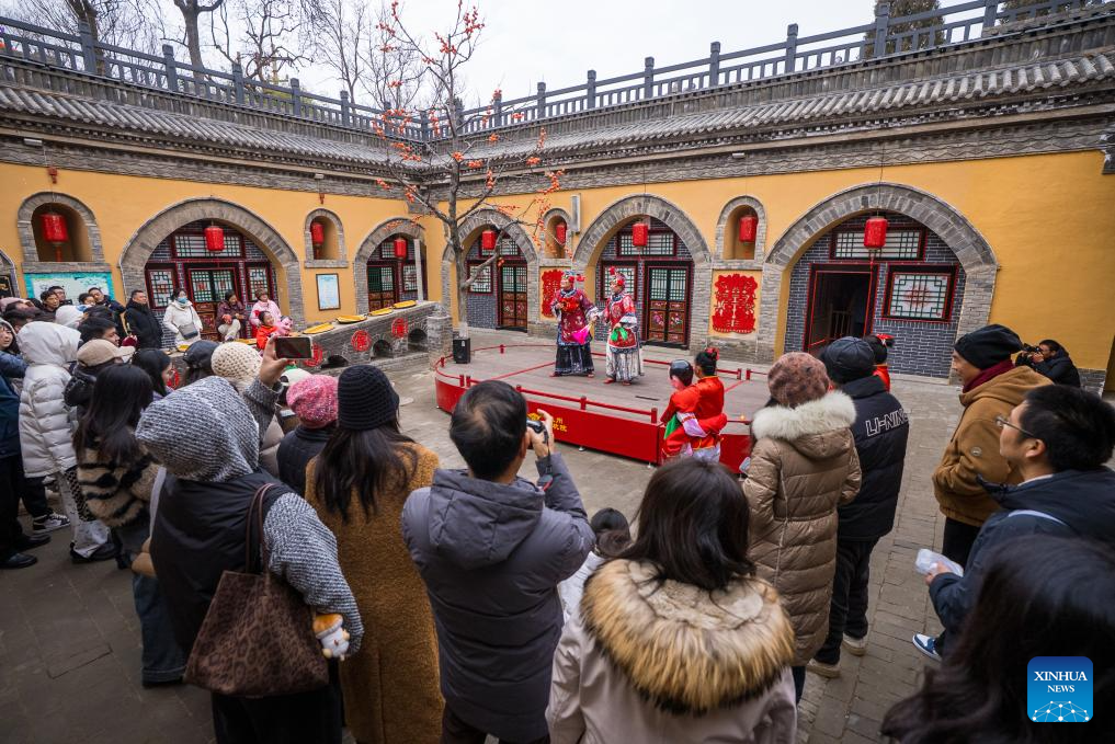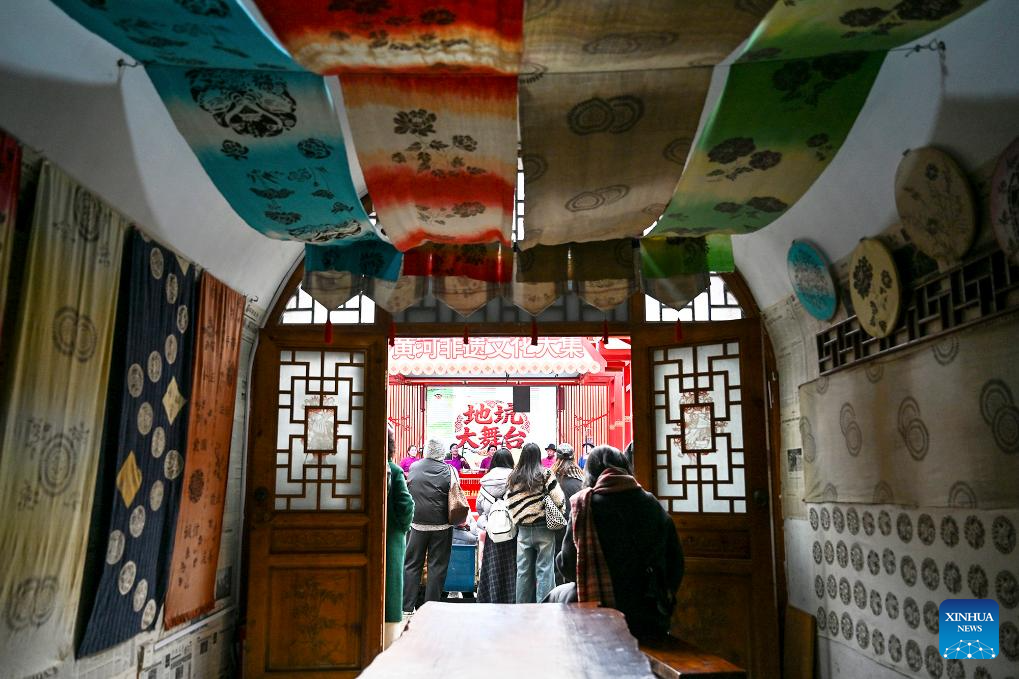 Tourists watch a folk performance at a traditional Dikengyuan residence in Beiying Village, Zhangbian Township, Shanzhou District, Sanmenxia City of central China's Henan Province, Dec. 21, 2025.