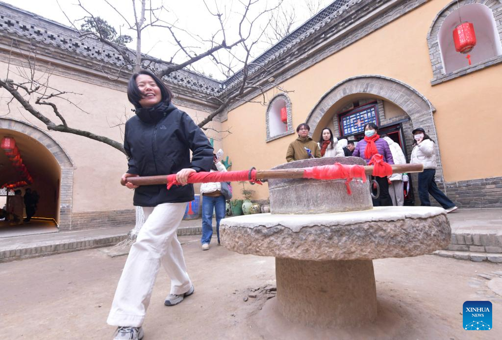 A tourist tries a stone mill at a traditional Dikengyuan residence in Beiying Village, Zhangbian Township, Shanzhou District, Sanmenxia City of central China's Henan Province, Dec. 21, 2025.
