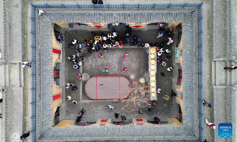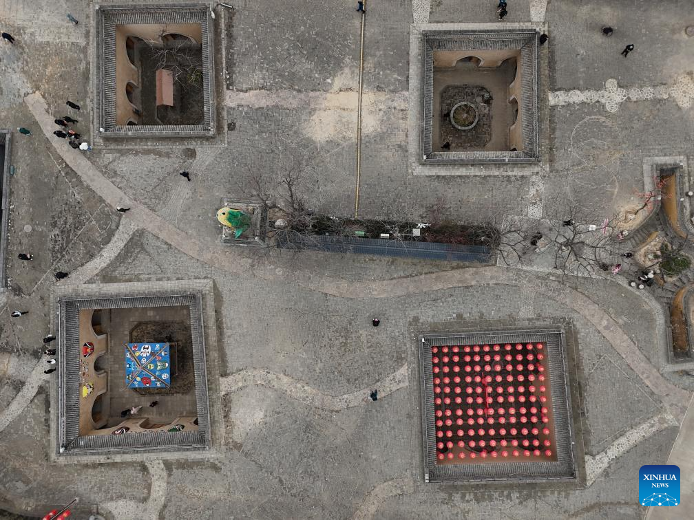An aerial drone photo taken on Dec. 21, 2025 shows tourists watching a folk performance at a traditional Dikengyuan residence in Beiying Village, Zhangbian Township, Shanzhou District, Sanmenxia City of central China's Henan Province.