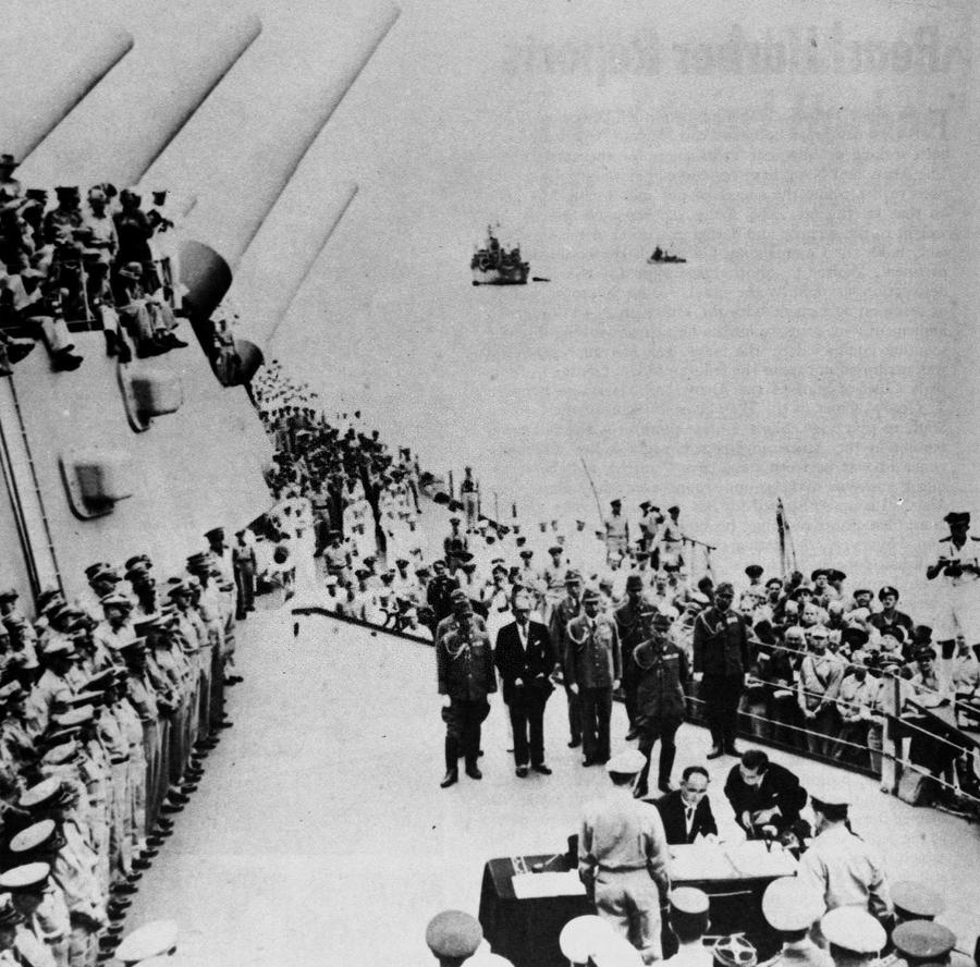 File photo taken on Sept. 2, 1945 shows Japan's surrender ceremony aboard the United States Navy battleship USS Missouri anchored in Tokyo Bay. (Xinhua)
