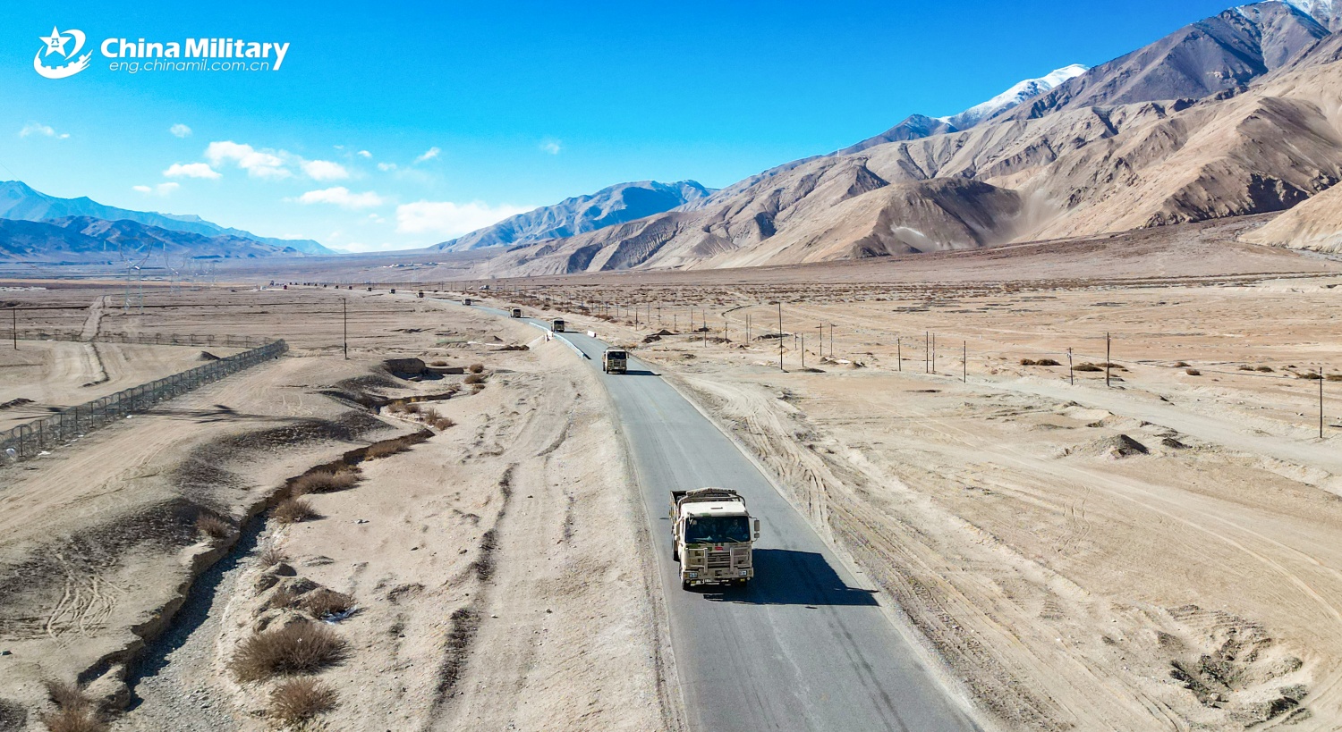 Military trucks attached to a regiment under the Chinese PLA Army are en route to the designated area during a long-distance maneuver exercise in late November, 2025. (eng.chinamil.com.cn/Photo by Zhang Jiahao)