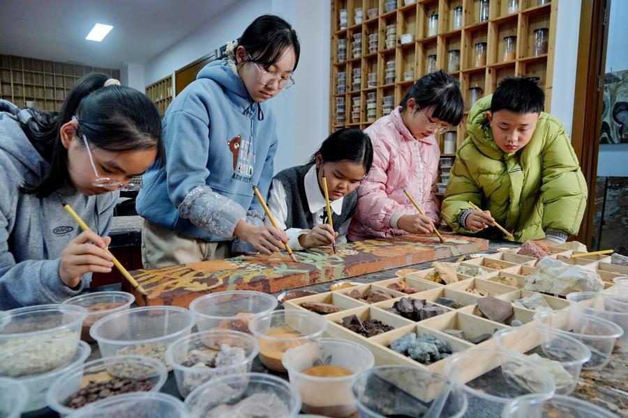 Children work on a piece of rock pigment painting in Wuyishan City, southeast China's Fujian Province, Dec. 20, 2025. (Photo by Chen Ying/Xinhua)