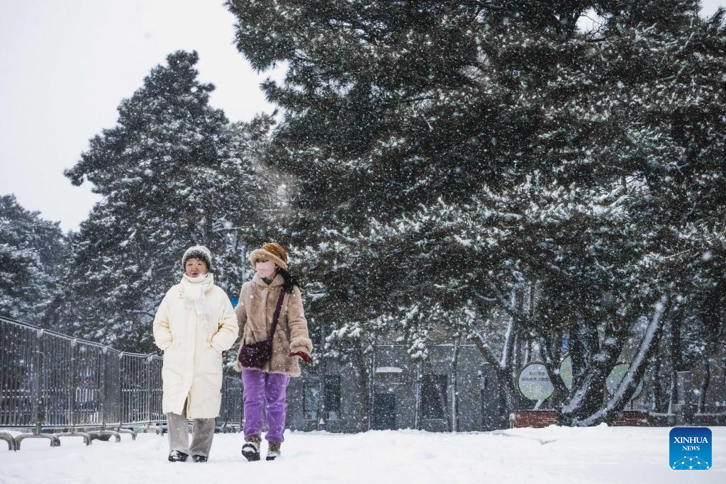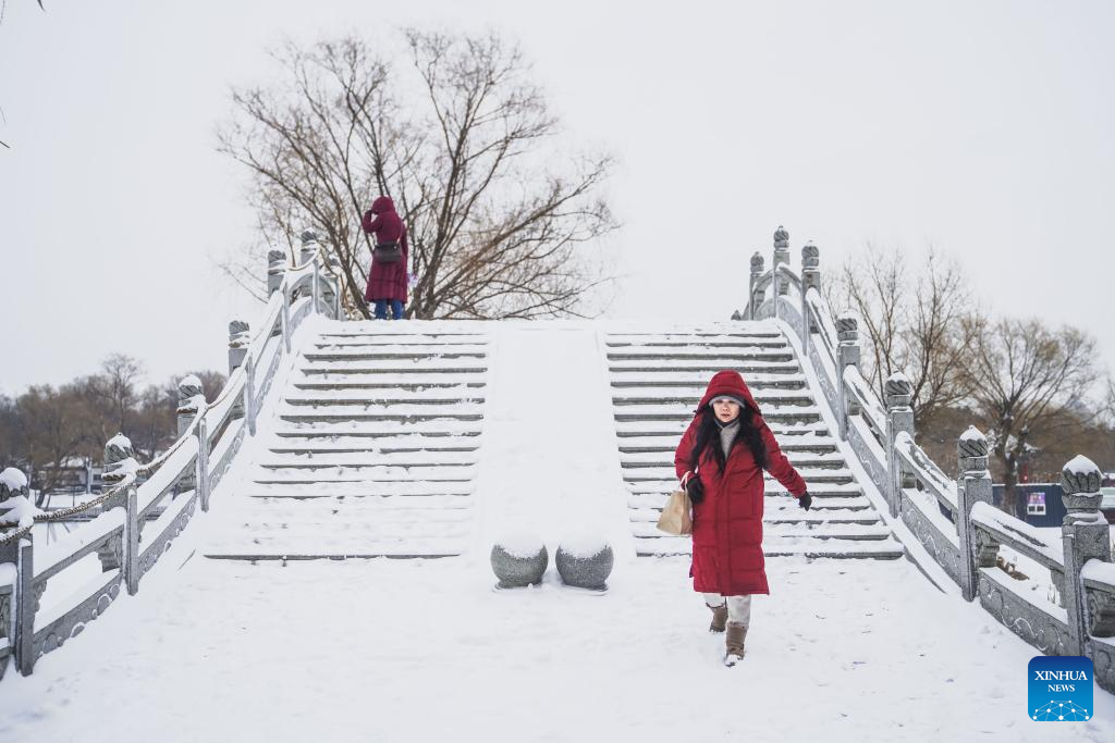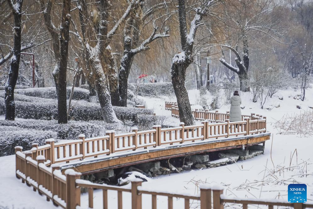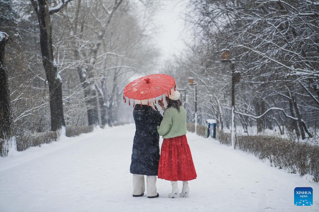 People enjoy the snow view at a park in Changchun, northeast China's Jilin Province, Dec. 23, 2025. Changchun on Tuesday experienced snowfalls due to the impact of a new cold front. (Xinhua/Xu Chang)