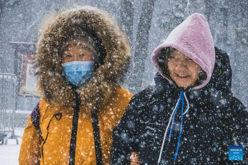People walk amid snow in Changchun, northeast China's Jilin Province, Dec. 23, 2025. Changchun on Tuesday experienced snowfalls due to the impact of a new cold front. (Xinhua/Xu Chang)