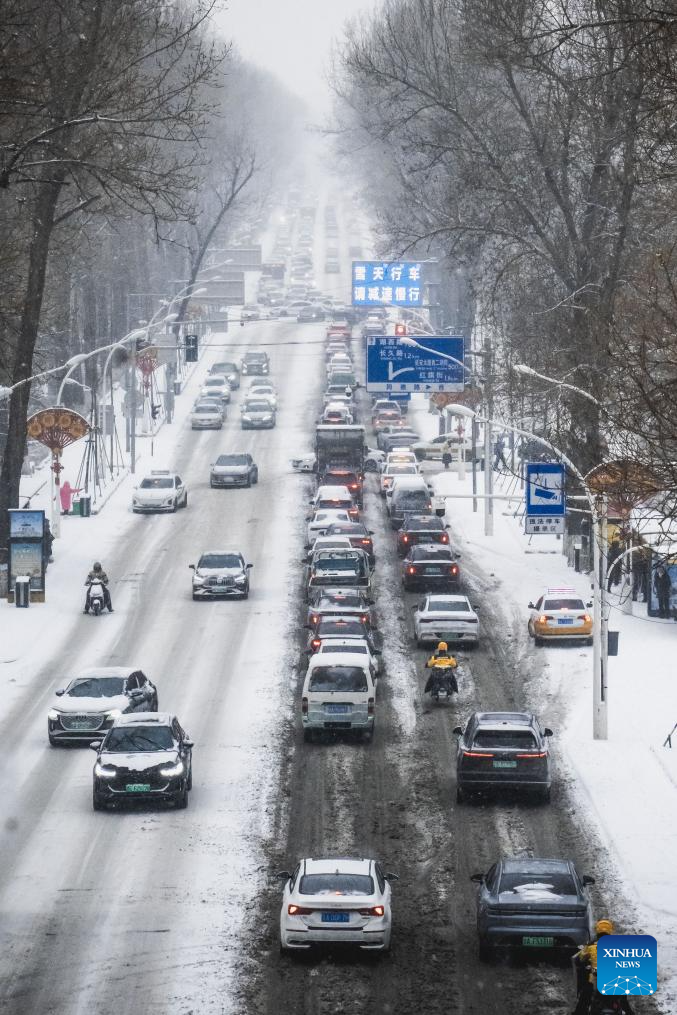 Vehicles travel on a street after snowfall in Changchun, northeast China's Jilin Province, Dec. 23, 2025. Changchun on Tuesday experienced snowfalls due to the impact of a new cold front. (Xinhua/Xu Chang)