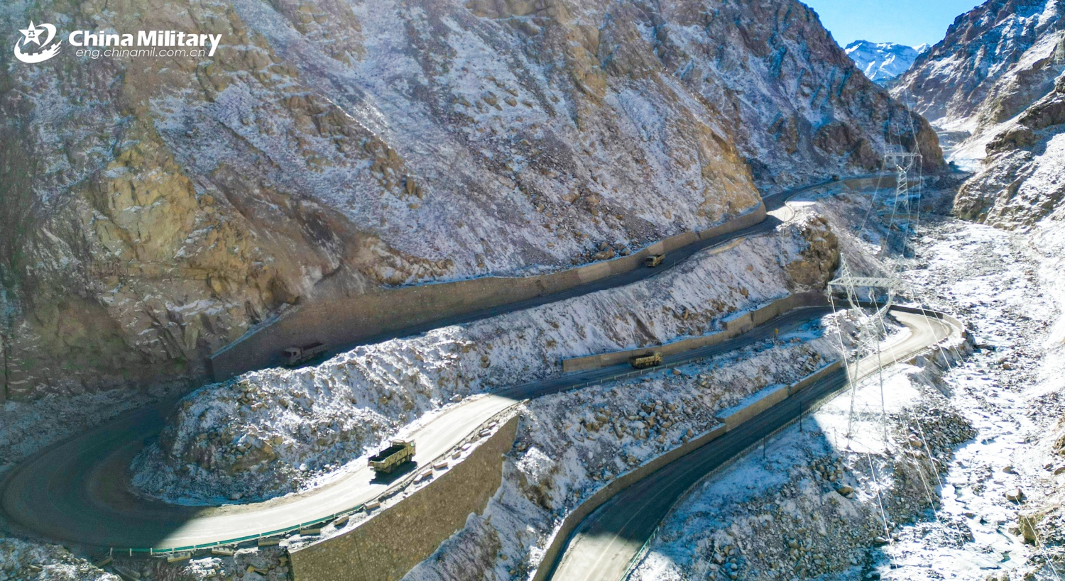 Military trucks attached to a regiment under the Chinese PLA Army steer on a zigzag road among the snow-clad hills during a long-distance maneuver exercise in late November, 2025. (eng.chinamil.com.cn/Photo by Zhang Jiahao)