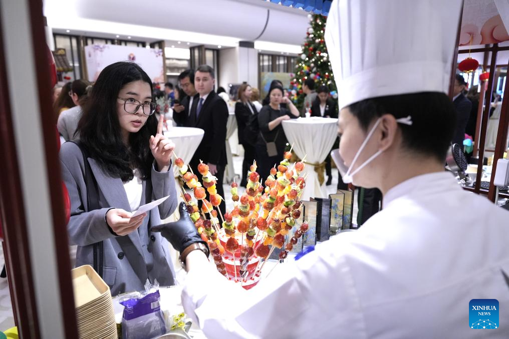 Local residents taste candied haws during the Chinese Food Festival held in Astana, Kazakhstan, Dec. 24, 2025. The Chinese Food Festival was held on Wednesday in Astana, the capital of Kazakhstan. (Photo by Kalizhan Ospanov/Xinhua)