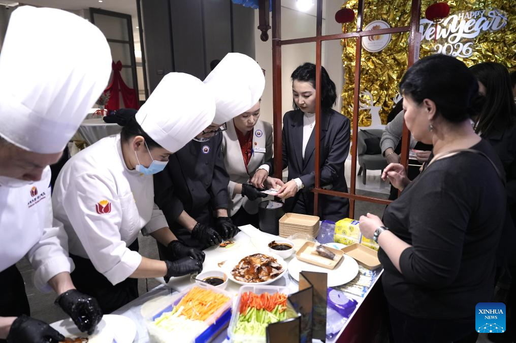 Local residents wait to taste Peking duck during the Chinese Food Festival held in Astana, Kazakhstan, Dec. 24, 2025. The Chinese Food Festival was held on Wednesday in Astana, the capital of Kazakhstan. (Photo by Kalizhan Ospanov/Xinhua)