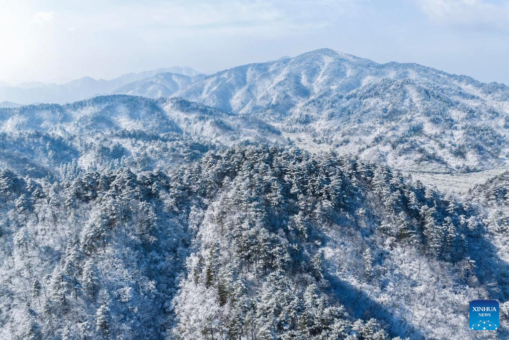 An aerial drone photo taken on Dec. 25, 2025 shows the scenery after snow in the Daming Mountain scenic area in Lin'an District of Hangzhou, east China's Zhejiang Province. Hangzhou's Daming Mountain scenic area saw snowfall under the influence of recent cold air. (Xinhua/Xu Yu)