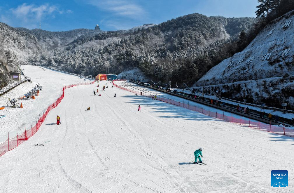 An aerial drone photo taken on Dec. 25, 2025 shows tourists skiing at a ski resort in the Daming Mountain scenic area in Lin'an District of Hangzhou, east China's Zhejiang Province. Hangzhou's Daming Mountain scenic area saw snowfall under the influence of recent cold air. (Xinhua/Xu Yu)