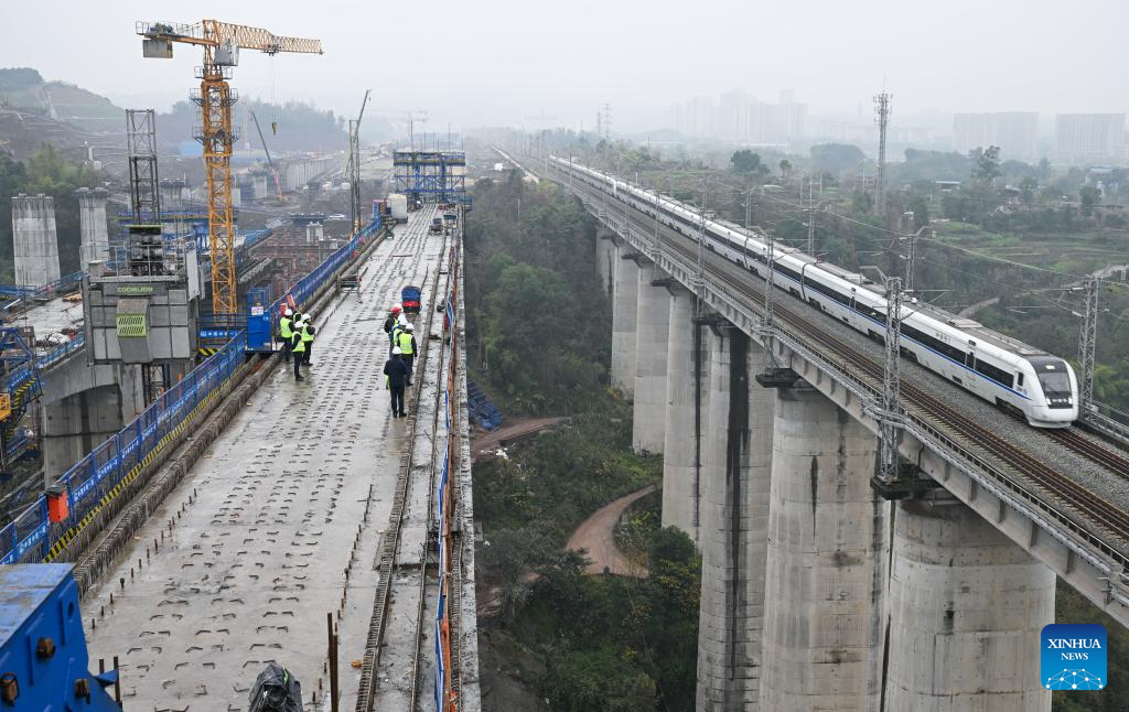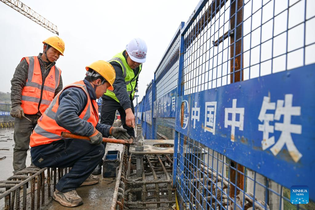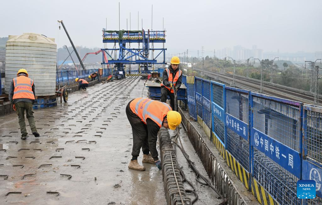 Constructors work at the construction site of a bridge along the Chongqing-Wanzhou high-speed railway in southwest China's Chongqing Municipality, Dec. 25, 2025. Upon completion, the Chongqing-Wanzhou high-speed railway, with a designed speed of 350 km per hour, will shorten travel time from downtown Chongqing to Wanzhou District to less than one hour. (Xinhua/Chen Cheng)