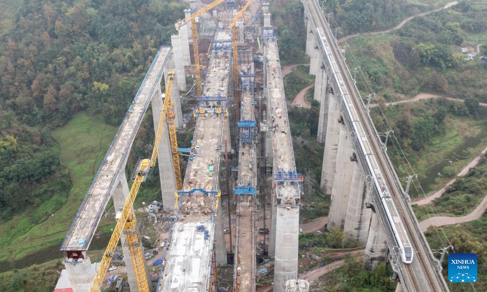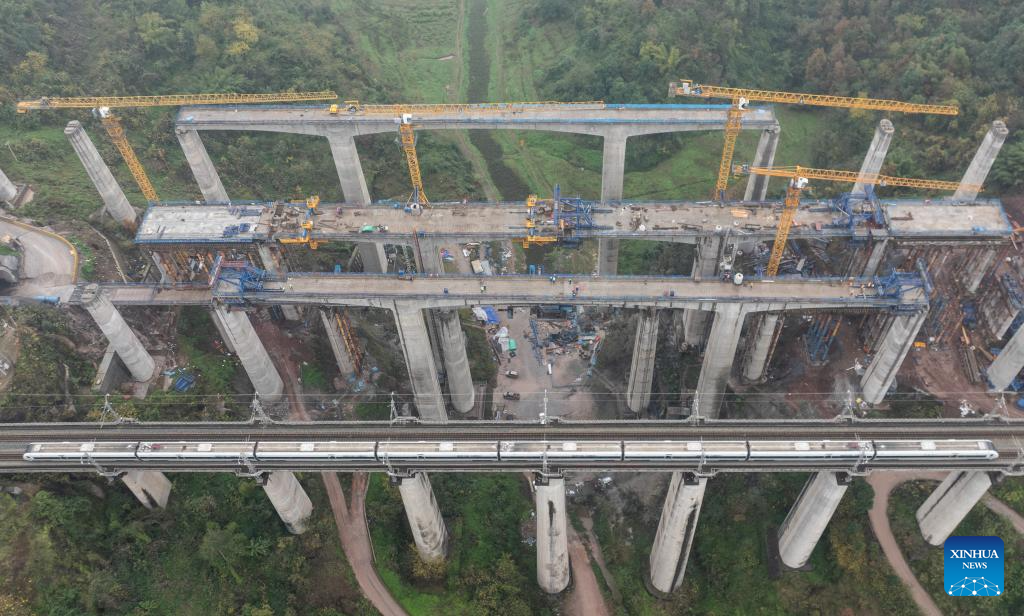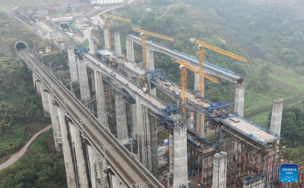 An aerial drone photo taken on Dec. 25, 2025 shows a bridge of the Chongqing-Wanzhou high-speed railway under construction in southwest China's Chongqing Municipality. Upon completion, the Chongqing-Wanzhou high-speed railway, with a designed speed of 350 km per hour, will shorten travel time from downtown Chongqing to Wanzhou District to less than one hour. (Xinhua/Chen Cheng)