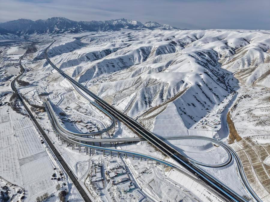 An aerial drone photo taken on Dec. 23, 2025 shows a view of Urumqi-Yuli Expressway that traverses the Tianshan Mountains in northwest China's Xinjiang Uygur Autonomous Region. (Xinhua/Hu Huhu)