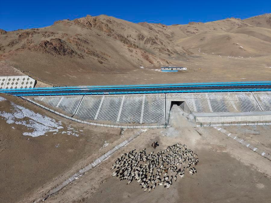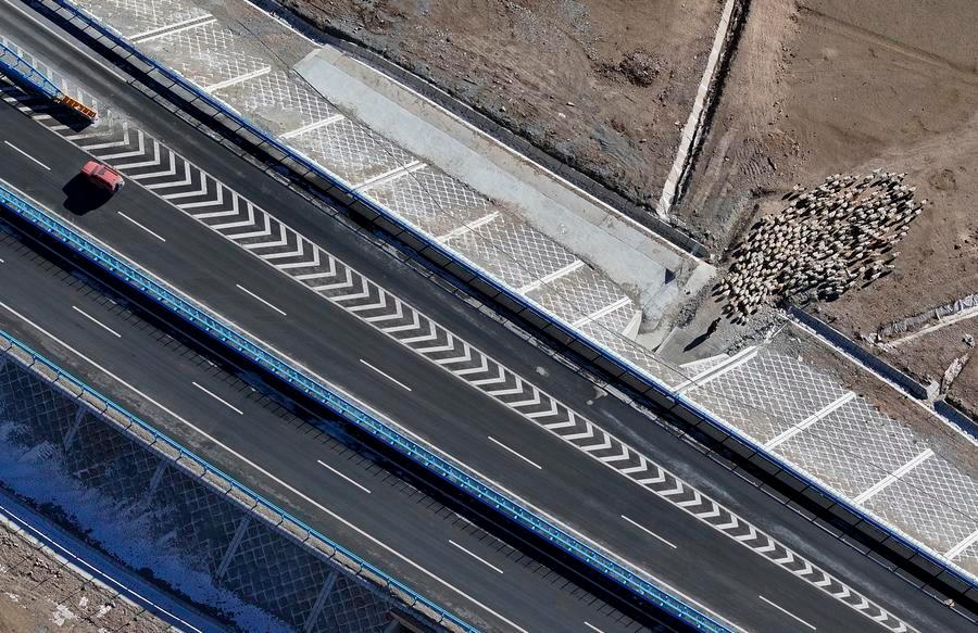 An aerial drone photo taken on Dec. 23, 2025 shows a herdsman driving sheep on the side of Urumqi-Yuli Expressway in Hejing County, northwest China's Xinjiang Uygur Autonomous Region. (Xinhua/Hu Huhu)