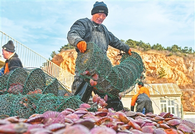 Fishermen sort scallops at a fishing port on Zhifu Island in Yantai city, east China's Shandong Province. (Photo/Sun Wentan)