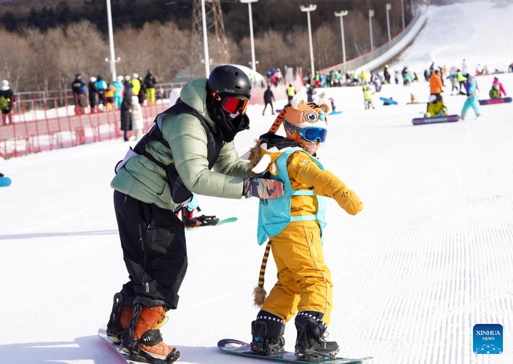 This file photo taken on Dec. 3, 2025 shows a child practicing skiing at a ski resort during a five-day "snow break" for primary and secondary school students in Jilin, northeast China's Jilin Province. (Xinhua/Yan Linyun)