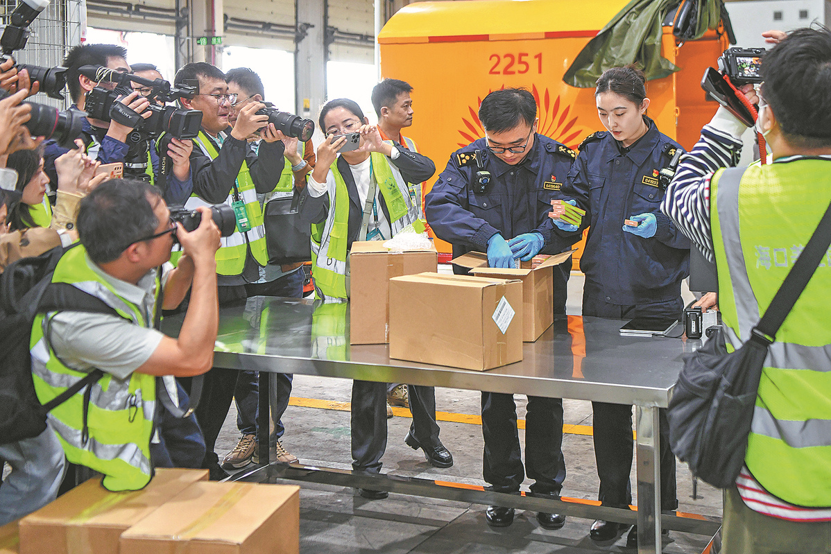 Customs officers conduct inspections on the first batch of goods to enjoy the policy of duty-free processing value-added tax at Haikou Meilan International Airport in Haikou on Dec 18. SU BIKUN/FOR CHINA DAILY