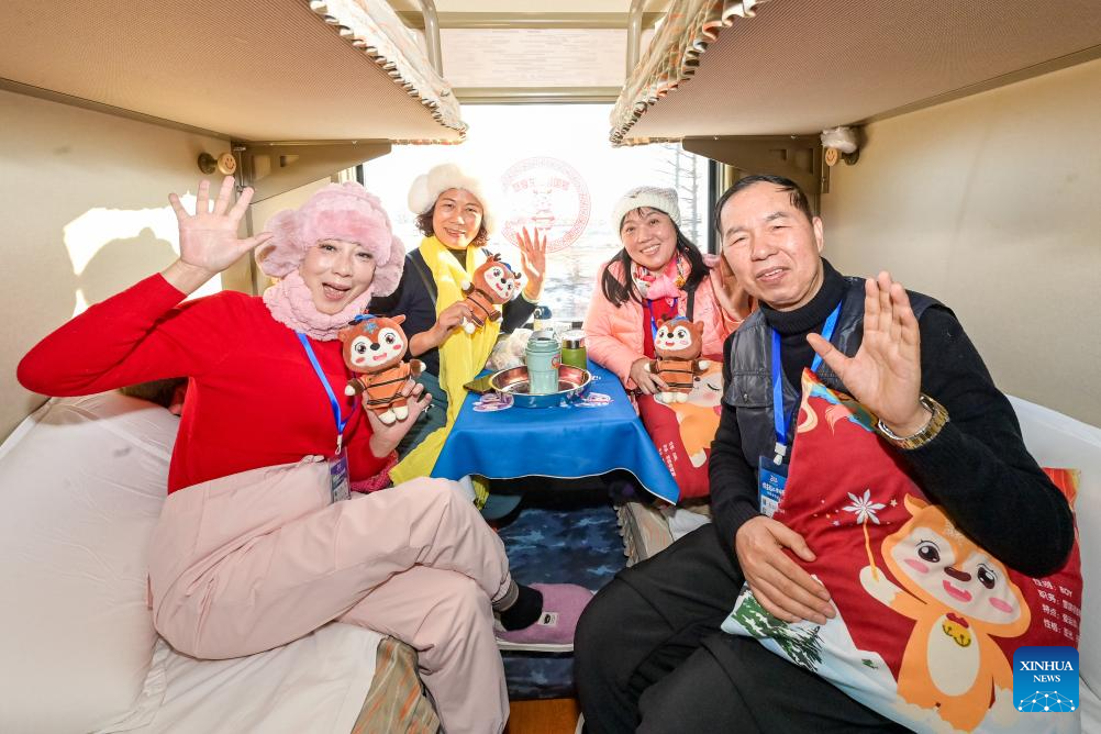 Tourists pose for photos onboard a tourism train in northeast China's Heilongjiang Province, on Dec. 28, 2025. Train Y999/998, an ice-and-snow themed tourism loop train, started a six-day trip on Sunday. (Photo by Yuan Yong/Xinhua)