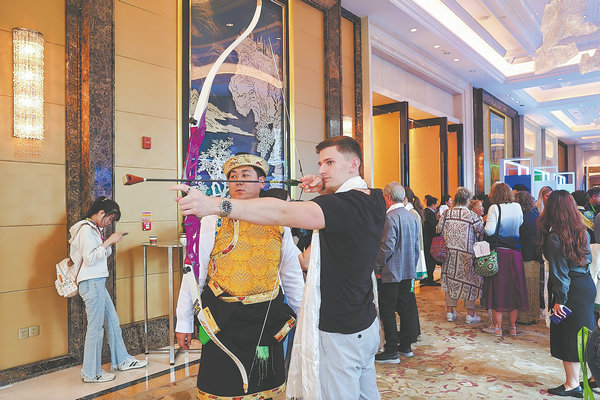 An international visitor tries his hand at Gongbo archery in Nyingchi, Xizang. CHINA DAILY