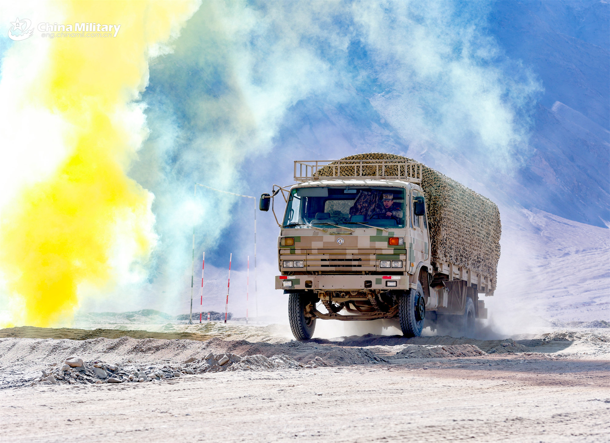 A military truck attached to an army division under the Chinese PLA Xinjiang Military Command drives through smoke and dust during a driving skill competition in late November, 2025. (eng.chinamil.com.cn/Photo by Liu Dingyao)