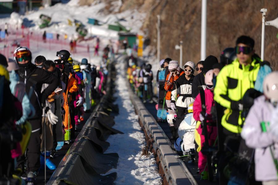 People are pictured on the conveyor belts at the SkyLand ski resort in Anji County of Huzhou City, east China's Zhejiang Province on Dec. 28, 2025. (Xinhua/Huang Zongzhi)
