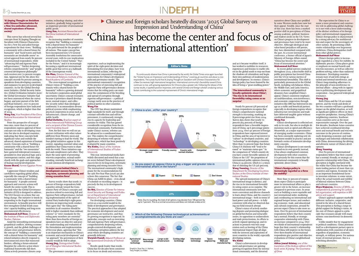 To continuously observe how China is perceived by the world, the Global Times once again launched the "Global Survey on Impression and Understanding of China," covering 46 countries and about 51,700 respondents. The survey found that Xi Jinping Thought on Socialism with Chinese Characteristics for a New Era receives high international recognition. International community's favorability toward China continues to rise, with growing expectations for China to play a greater role. Following the release of the survey results, it sparked positive responses, with several Chinese and foreign scholars analyzing various factors contributing to the sustained improvement of China's international image.