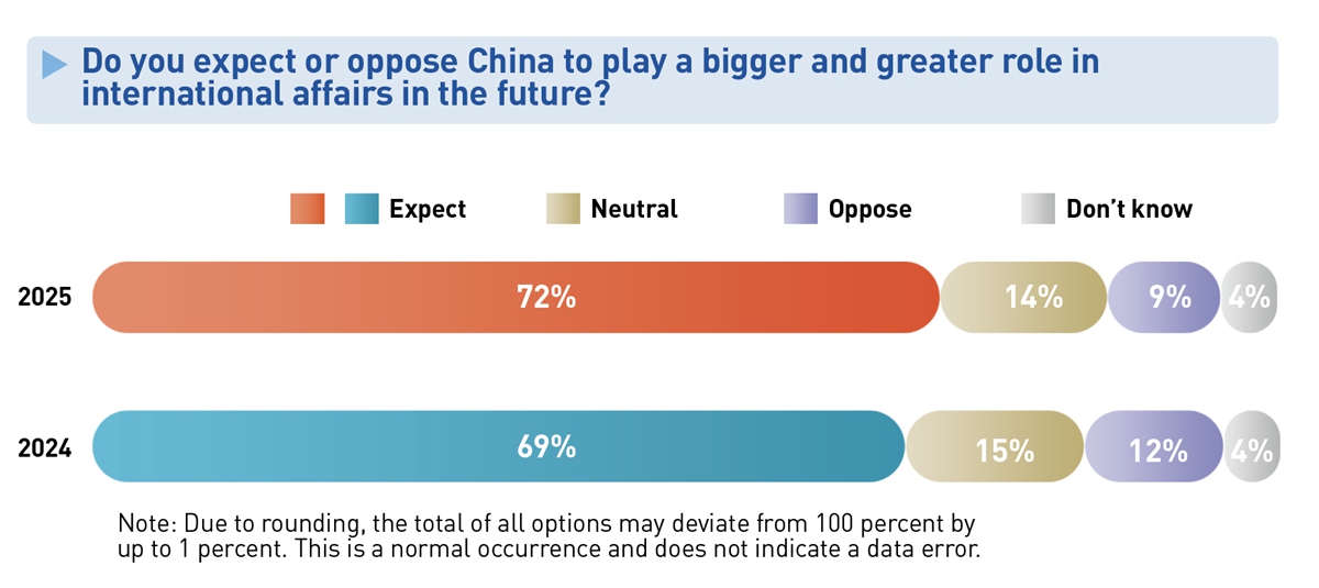 More than 70 percent of respondents expect China to participate more in international affairs or play a greater role in the future, an increase compared to previous years. In areas such as building a more equitable and just international order, mediating and coordinating on international and regional hotspot issues, and conducting economic, trade, and educational and cultural cooperation, around 80 percent expect China to take more actions. Over 80 percent of international respondents believe that their country has a normal, friendly, or strategic cooperative relationship with China, an increase compared to 2024. Over two-thirds of international respondents hope that their country's relationship with China will improve in the future. Over three-fourths of international respondents give positive and objective evaluations of China's neighborhood policy.