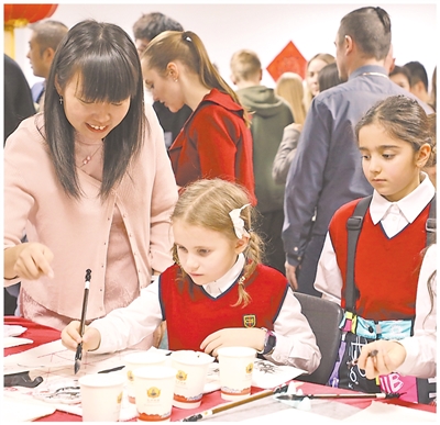 Students at the Moscow Campus of Cambridge International School learn Chinese calligraphy under their teacher's guidance during a Chinese New Year celebration in Moscow, Russia, in February 2025. (People's Daily/Xiao Xinxin)