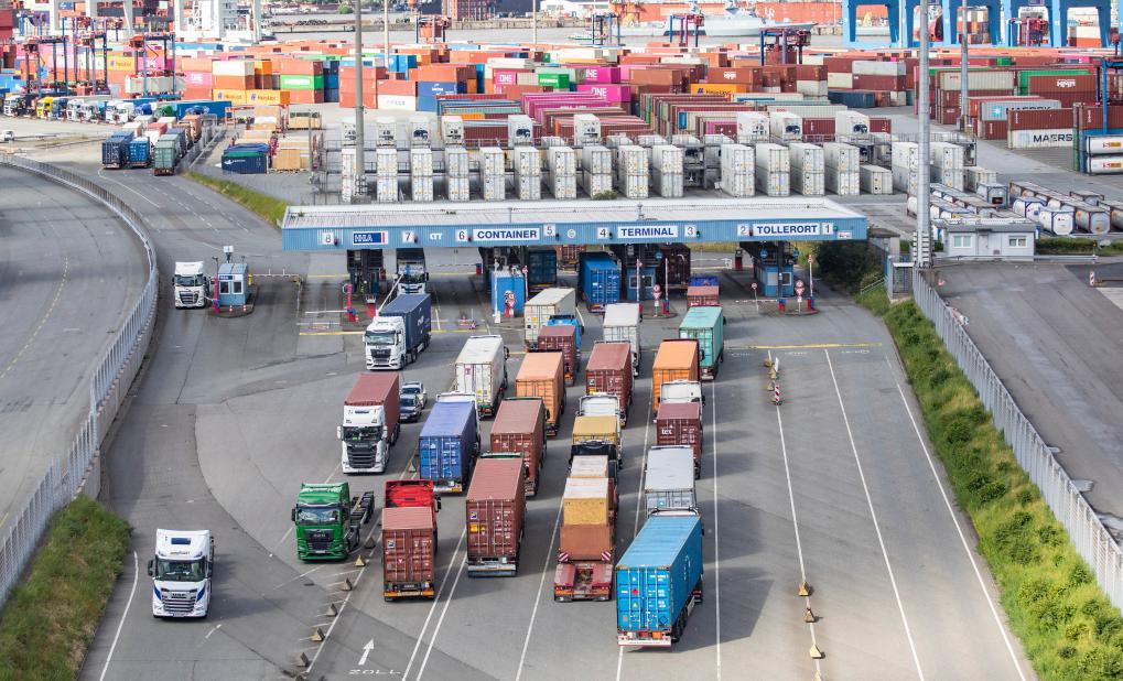 Trucks wait to enter the Container Terminal Tollerort in Hamburg, Germany, May 28, 2025. (Xinhua/Zhang Fan)
