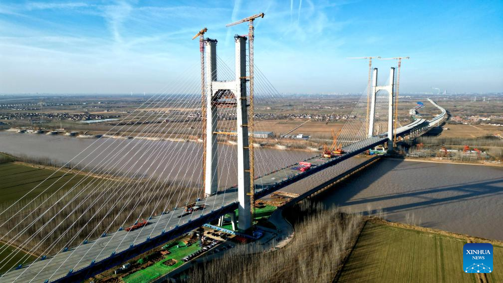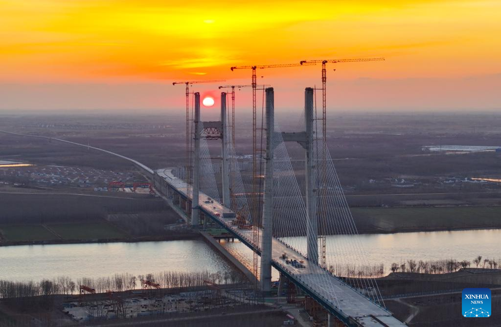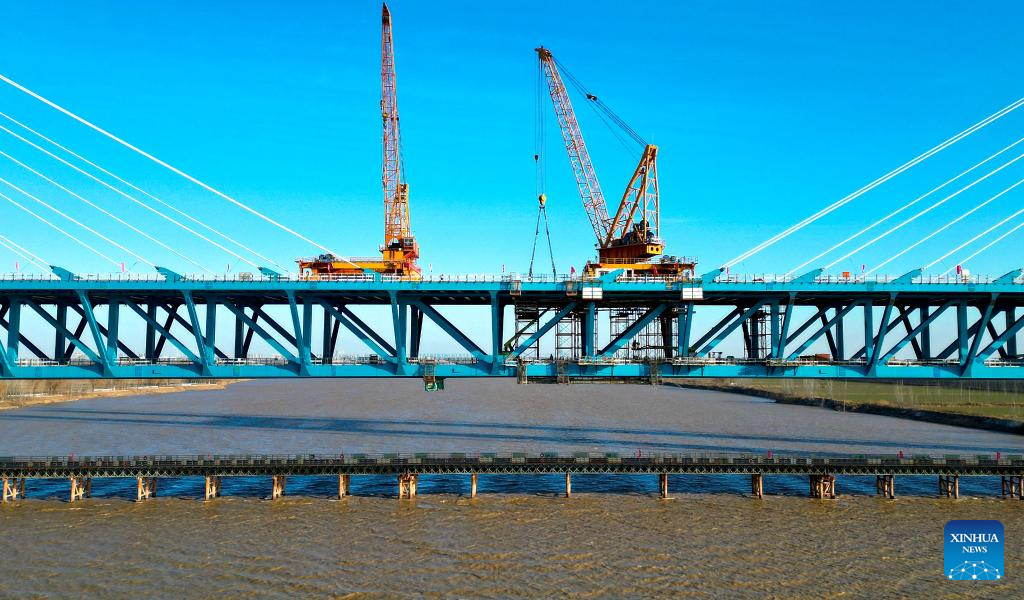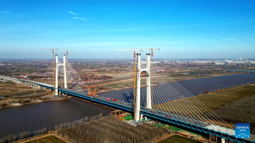 A drone photo taken on Dec. 31, 2025 shows the Dongying Yellow River highway-railway bridge under construction in Dongying, east China's Shandong Province.