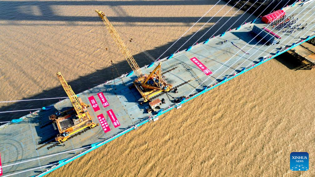An aerial drone photo taken on Dec. 31, 2025 shows the Dongying Yellow River highway-railway bridge under construction in Dongying, east China's Shandong Province.
