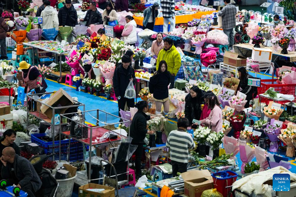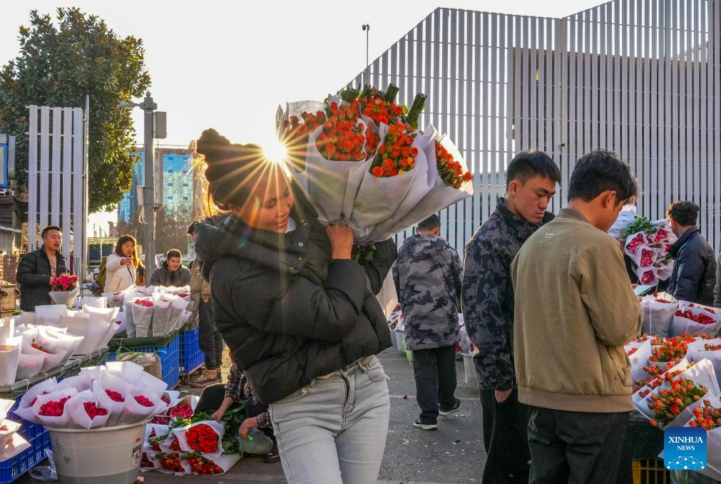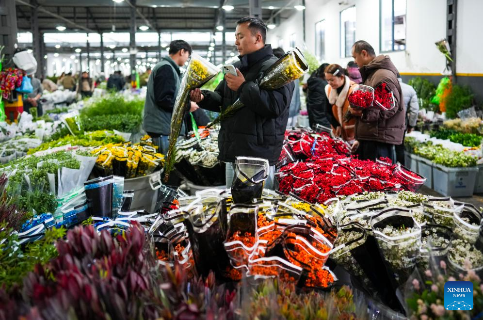 People select fresh-cut flowers at the Dounan Flower Market in Kunming, southwest China's Yunnan Province, Dec. 31, 2025. As the New Year approaches, the Dounan Flower Market in Kunming, dubbed the "flower capital of Asia," is gradually heating up. (Xinhua/Chen Xinbo)
