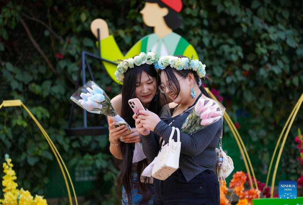 Tourists check their selfies at the Dounan Flower Market in Kunming, southwest China's Yunnan Province, Dec. 31, 2025. As the New Year approaches, the Dounan Flower Market in Kunming, dubbed the "flower capital of Asia," is gradually heating up. (Xinhua/Chen Xinbo)