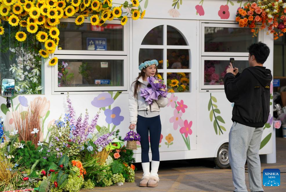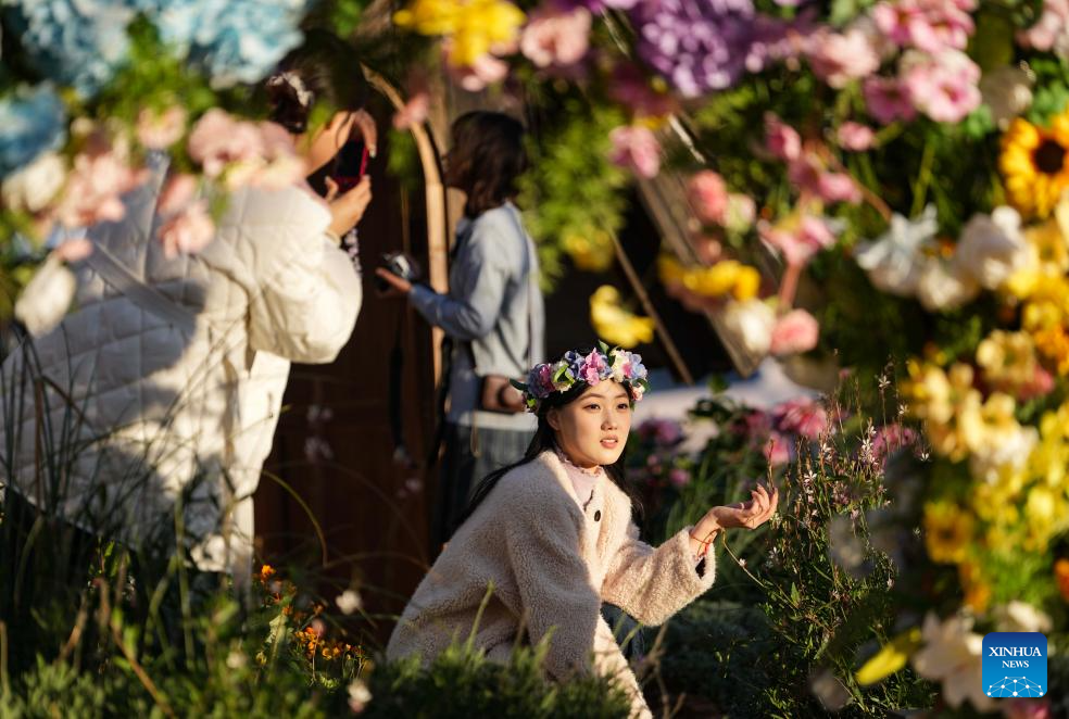 A tourist poses for a photo at the Dounan Flower Market in Kunming, southwest China's Yunnan Province, Dec. 31, 2025. As the New Year approaches, the Dounan Flower Market in Kunming, dubbed the "flower capital of Asia," is gradually heating up. (Xinhua/Chen Xinbo)