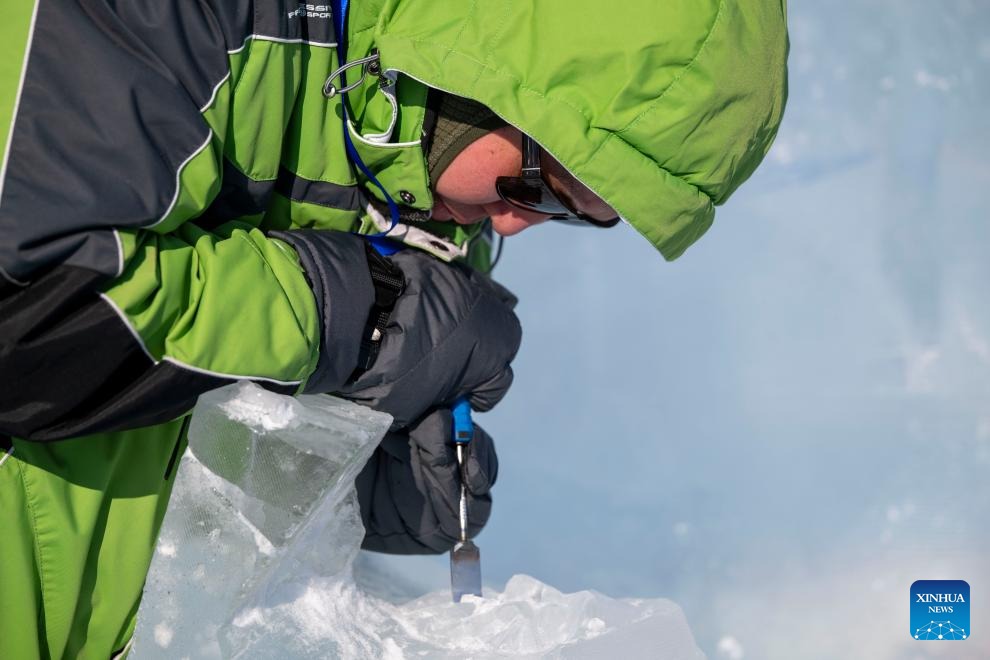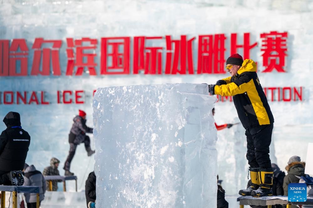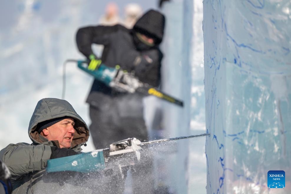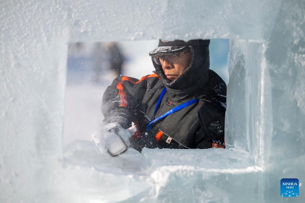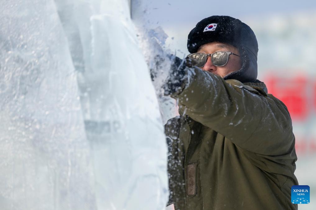 A competitor works on an ice sculpture during the 37th China Harbin International Ice Sculpture Competition at the Harbin Ice-Snow World in Harbin, northeast China's Heilongjiang Province, Jan. 2, 2026. The competition kicked off here on Friday. (Xinhua/Zhang Tao)