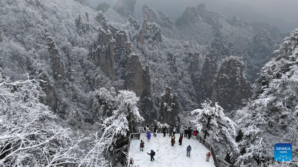 An aerial drone photo taken on Jan. 2, 2026 shows people enjoying the snow scenery at Zhangjiajie National Forest Park in Zhangjiajie, central China's Hunan Province. (Xinhua/Chen Zhenhai)