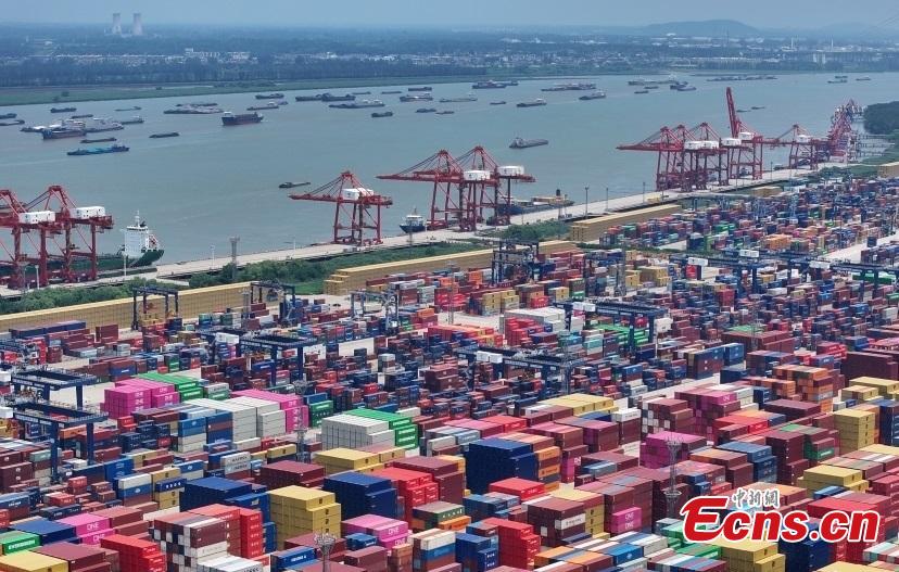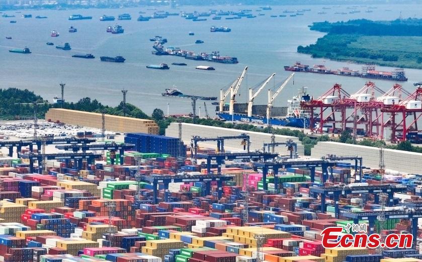 An aerial drone photo taken on July 14, 2025 shows the import and export container terminal at Longtan Port in Nanjing City along the Yangtze River. (Photo: China News Service/Yang Bo)