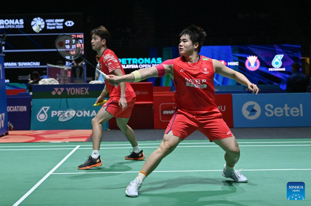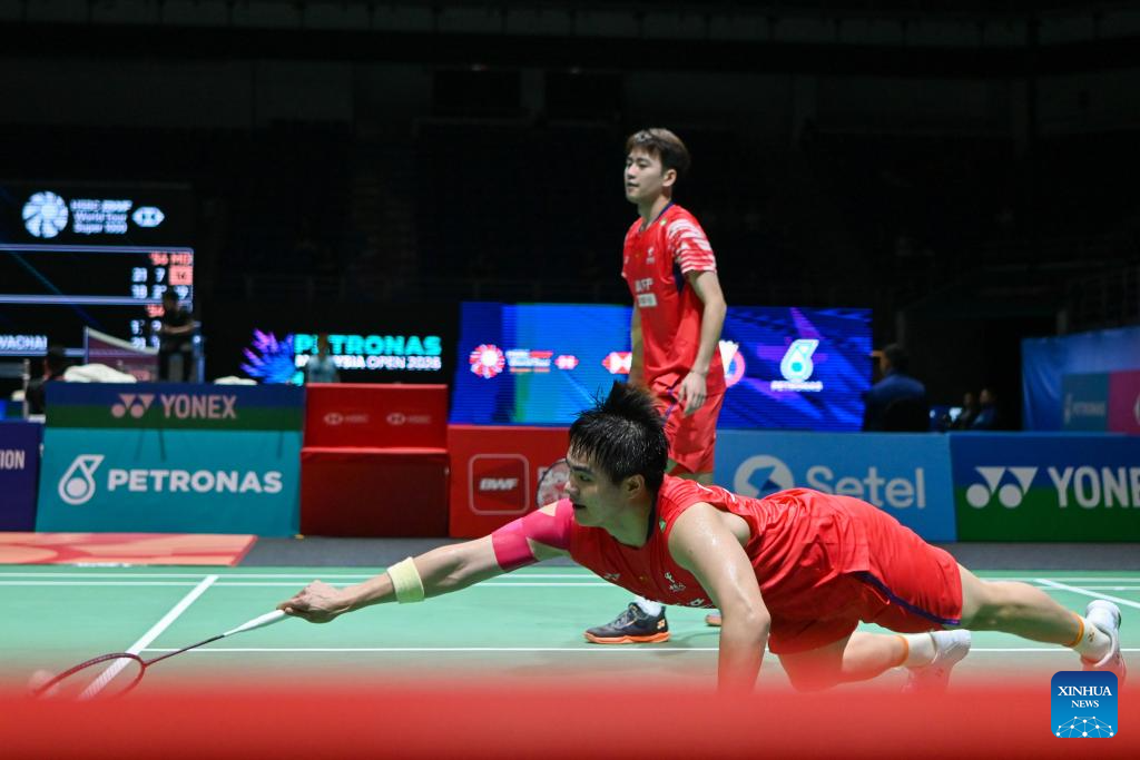 Liang Weikeng (R)/Wang Chang of China compete during the men's doubles round of 32 match against Hoki Takuro/Kobayashi Yugo of Japan at the Malaysia Open 2026 badminton tournament in Kuala Lumpur, Malaysia, Jan. 6, 2026. (Photo by Chong Voon Chung/Xinhua)