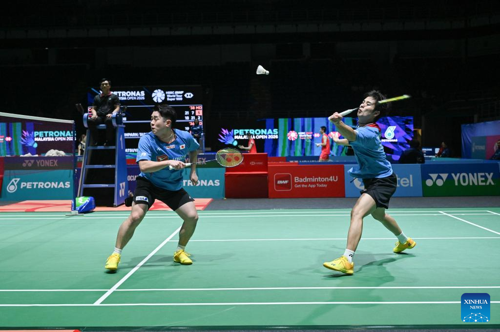 Hoki Takuro (L)/Kobayashi Yugo of Japan compete during the men's doubles round of 32 match against Liang Weikeng/Wang Chang of China at the Malaysia Open 2026 badminton tournament in Kuala Lumpur, Malaysia, Jan. 6, 2026. (Photo by Chong Voon Chung/Xinhua)